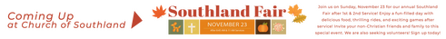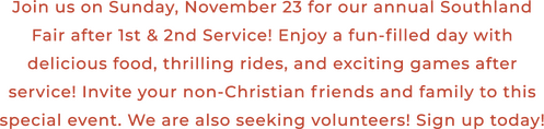 The fair will be held on 11/23 after the 1st and 2nd services. Enjoy a fun-filled time of delicious food, thrilling rides, and exciting games following the service!