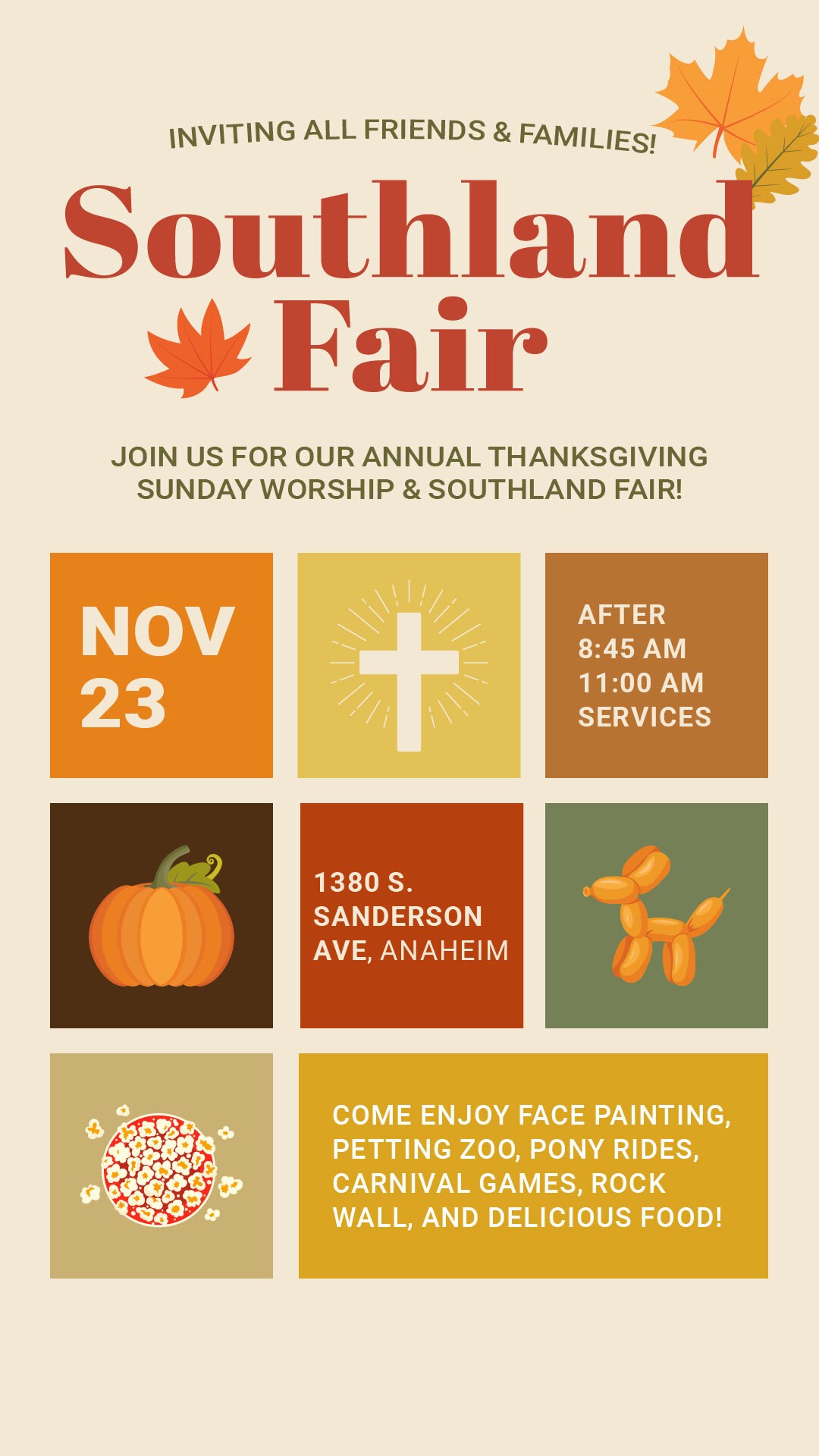 The fair will be held on 11/23 after the 1st and 2nd services. Enjoy a fun-filled time of delicious food, thrilling rides, and exciting games following the service!