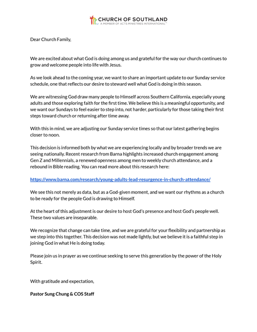 A: As we see God moving in the hearts of new believers in the SoCal region, especially college students and young adults, we want to make it as welcoming as possible for them to attend service, and moving up the third service time will help accomplish this.