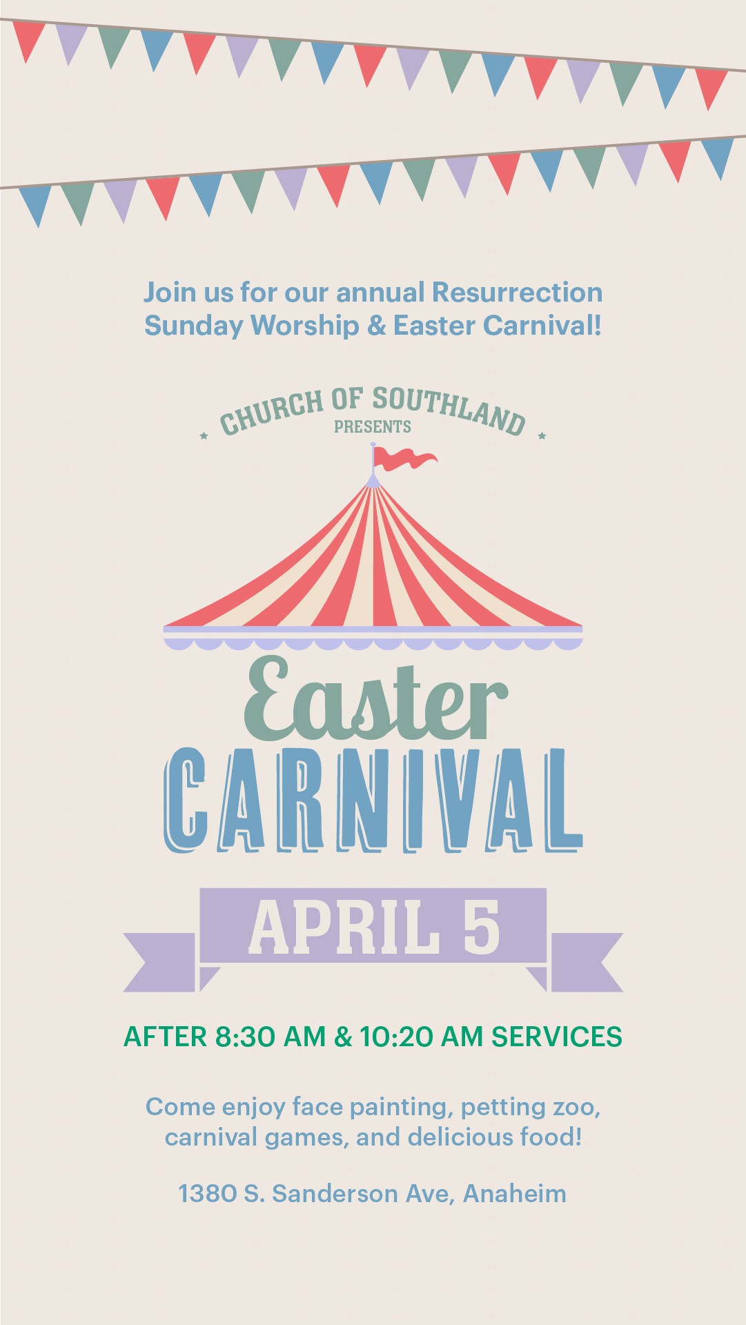 Join us on April 5th for our Resurrection Sunday Service and Easter Carnival! Enjoy food, rides, and games after 1st & 2nd services.
